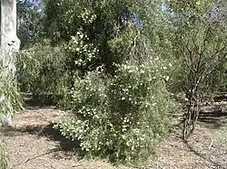 The white flowers are grouped in spikes up to 30 mm (1 in) long at the ends of branches which continue to grow after flowering, and sometimes in the upper leaf axils. Each spike contains 3 to 16 flowers loosely arranged and up to 35 mm (1 in) in diameter. The petals are 3.5–3.8 mm (0.14–0.15 in) and fall off as the flower matures. The stamens are arranged in five bundles around the flower and there are 11 to 26 stamens in each bundle. Flowering occurs in early spring but the flowers are relatively short-lived. The fruit are woody, cup or barrel-shaped capsules 4–5 mm (0.16–0.20 in) long, 4–7 mm (0.2–0.3 in) in diameter and spaced along the branches.[2][3][4][5]