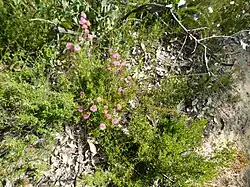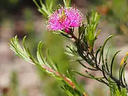 The flowers are arranged in heads or short spikes on the ends of branches which continue to grow after flowering, or sometimes in the upper leaf axils. The heads are up to 25 mm (1 in) in diameter and contain between 2 and 8 groups of flowers in threes. The petals are 1.7–3 mm (0.07–0.1 in) long and fall off soon after the flowers open. The stamens, which give the flower it colour are shades of pink, purple or mauve with yellow tips and are arranged in five bundles around the flower, each bundle containing 6 to 10 stamens. Flowering is in spring and early summer and is followed by fruit which are woody capsules 2.5–3.5 mm (0.098–0.14 in) long.[2][3]