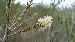 The flowers are arranged in a short spike or head at the ends of branches which continue to grow after flowering and sometimes in the upper leaf axils. The spikes contain 15 to 50 individual flowers and are up to 11 mm (0.4 in) in diameter. The flowers are a light cream colour and each is surrounded by five bundles of stamens, containing 3 to 8 stamens. The petals are 1.5–2 mm (0.06–0.08 in) long and often tinged with pink. Spring is the main flowering season and the flowers are followed by fruit which are woody capsules about 3 mm (0.1 in) long and wide, in clusters along the branches.[2][3][4]
