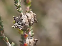 Appearing from September to February, sometimes in April or May, the flowers are pink to mauve in colour. They occur singly or in groups of up to four, forming small heads up to 20 mm (0.8 in) in diameter, mostly at or near the ends of the branches. The petals are 3.8–6.6 mm (0.1–0.3 in) long and fall off as the flower matures. There are five bundles of stamens around the flower, each with 45-100 stamens. Each bundle contains about 45 to 80 short, (sterile) stamens and 10 to 15 long, curved, outer stamens. Flowering is followed by fruit which are woody, urn-shaped capsules, 3.3–4.5 mm (0.1–0.2 in) long and about 6 mm (0.2 in) in diameter.[2][3]