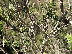 The flowers are a shade of pink, arranged in heads on the ends of most of the branches which continue to grow after flowering and sometimes also in the upper leaf axils. The heads are up to 25 mm (1 in) in diameter and contain 8 to 15 groups of flowers in threes. The petals are 2.5–3.3 mm (0.098–0.13 in) long and fall off as the flower matures. There are five bundles of stamens around the flower, each with 5 to 9 stamens. Flowering occurs in spring and is followed by fruit which are woody, cup-shaped capsules, 2.5–4 mm (0.1–0.2 in) long and usually in almost spherical clusters along the stem.[2][3]
