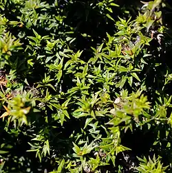 The flowers are white, fading to pink, and are arranged in heads 13–18 mm (0.5–0.7 in) in diameter in the axils of the leaves, each head with 3 to 5 groups of flowers in threes. (M. cliffortioides has single flowers in its leaf axils.) The petals are 2–2.3 mm (0.08–0.09 in) long and fall off as the flower matures. The stamens are arranged in five bundles around the flower, each bundle containing 12 to 15 stamens. The style is 6.8–10.6 mm (0.3–0.4 in) long (about 13 mm (0.5 in) in M. cliffortioides). Flowering occurs in November and December and is followed by fruits which are woody capsules 1.7–3 mm (0.07–0.1 in) long small teeth around the rim[2][3]