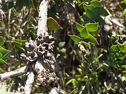 The flowers are yellow to lime-green and arranged in heads on the sides of the branches. Each head contains 5 to 15 individual flowers and is up to 45 mm (1.8 in) in diameter. The petals are 4.5–6.5 mm (0.18–0.26 in) long (compared to 3–3.7 mm (0.12–0.15 in) in M. longistaminea) and fall off as the flowers mature. The stamens are arranged in five bundles around the flowers and there are 9 to 24 stamens per bundle. The flowering period is from August to late November and is followed by fruit which are woody capsules 3.5–6.5 mm (0.14–0.26 in) long with teeth around the edges and in clusters along the branches.[2][3][4]