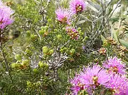The flowers are a shade of pink to purple and are arranged in heads on the ends of branches which continue to grow after flowering. The heads contain 2 to 6 groups of flowers in threes and are up to 16 mm (0.6 in) in diameter. The stamens are arranged in five bundles around the flowers and each bundle contains 3 to 7 (but mostly 3) stamens. Flowering occurs between August and January and is followed by fruit which are woody capsules 2.5–4 mm (0.1–0.2 in) long in loose clusters.[2][3]