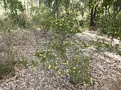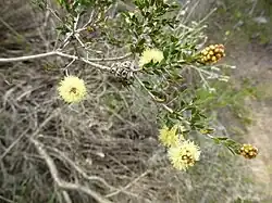 The flowers are bright yellow, and arranged in a spike or a head near the ends of branches. The heads are up to 15 mm (0.6 in) in diameter and contain 2 to 15 groups of flowers in threes. The stamens are arranged in five bundles around the flower, each bundle with 7 to 11 stamens. Flowering occurs from August to February but mainly in October and November. The fruit which follow are woody capsules 2.3–4 mm (0.09–0.2 in) long in clusters of about six which are about 10 mm (0.4 in) in diameter. The rim of the fruit are flat.[2][3]