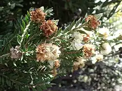 The flowers are white, pale cream or pink in colour and are arranged in heads or short spikes on the ends of branches that continue to grow after flowering. The heads contain 2 to 10 groups of flowers in threes and are up to 23 mm (0.9 in) in diameter but sometimes the flowers may be in small groups of individual flowers. The petals are 2–3 mm (0.08–0.1 in) long and fall off as the flower ages. The stamens are in five bundles around the flowers, each bundle containing 10 to 16 stamens. Flowering usually occurs in December and is followed by the fruit which are woody, almost spherical capsules 4–5 mm (0.16–0.20 in) in diameter.[2][3][4]