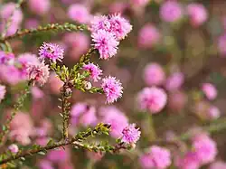 The flowers are arranged in heads up to 25 mm (1 in) in diameter, at or near the ends of the branches, with one to seven groups of flowers, each with three individual flowers. There are hairy brown bracts at the base of the flowers and the flower buds are covered with white, woolly hairs. The flowers appear from August to December, varying slightly with each variety, and are pale to mid-pink or mauve. The stamens are arranged in bundles of five around the flower, with six to ten stamens in each bundle, the bright yellow anthers contrasting with the mauve filaments. The cup-shaped base of the flower (the hypanthium) is hairy and 1.5–3 millimetres (0.06–0.1 in) long. The woody capsules are 3–4 mm (0.1–0.2 in) long and wide.[2][3]