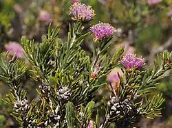 The flowers are arranged in heads about 25 mm (1 in) in diameter, near the ends of the branches, with two to five groups of flowers, each with three individual flowers. The flowers appear in September and October and are purple or deep mauve. The stamens are arranged in bundles of five around the flower, with seven to ten stamens in each bundle. The base of the flower is hairy and 2.0–2.5 mm (0.08–0.1 in) long. The fruit are woody capsules 3–4.5 mm (0.1–0.2 in) long and wide.[2][3]