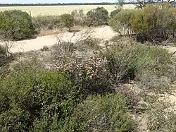 This melaleuca occurs only in the Wongan Hills district. It usually grows in depressions near salt lakes in calcareous soils.[6] It grows in dense scrub or heath on sand, clayey sand with lateritic pebbles and sand over granite and laterite.[3] The type specimen has the note that it was collected on "Gently undulating terrain, east of hills, orange clayey sand with numerous lateritic pebbles. Melaleuca heath-thicket by side of road. Locally common."[7]