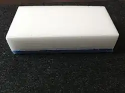 In the early 21st century, it was discovered that melamine foam is an effective abrasive cleaner and the first Mr. Clean Magic Eraser was released in 2003.[4][5][6] Rubbing with a slightly moistened foam may remove otherwise "uncleanable" external markings from surfaces. For example, melamine foam can remove crayon, marker pen, and grease from painted walls and wood finishings, plastic-adhering paints from treated wooden tables, and adhesive residue and grime from hubcaps.[7] If the surface being cleaned is not sufficiently hard, it may be finely scratched by the melamine material. Similarly to a pencil eraser, the foam wears away during use, leaving behind a slight residue which can be rinsed off.