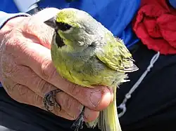 Yellow-bridled finch being ringed in Chile.