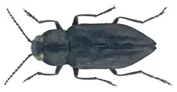 The beetle species stands out within its fauna due to its large body size and metallic-black appearance, especially distinguished by its elytra that extends into a pointed shape. Its dorsal surface is between 8 and 11mm long and its ventral surface is adorned with stiff bristles. Their heads feature prominent eyes and lines across the forehand. Between sexes, males have middle legs with tiny teeth and a deep cut at its dorsal.[14]