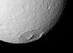 Melanthius is the third-largest impact crater on Tethys, one of Saturn's moons. Melanthius is 245 kilometers (152 mi) wide, and is located in the southern quadrant of Melanthius, named after the crater. Melanthius is noted for its prominent cluster of central peaks, which were formed in the original impact.[1] The crater is centered at 58.5°S, 192.61°W.[2]