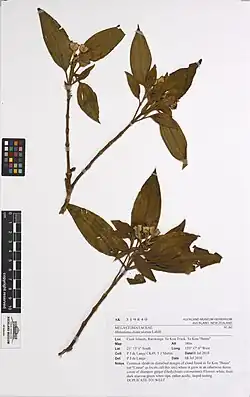 Melastoma denticulatum was first described by Jacques Labillardière in 1825.[2] Its acceptance as a distinct species has varied. It is accepted by Plants of the World Online, as of November 2020.[1] It has also been treated as a synonym of Melastoma malabathricum and Melastoma affine, and also as misapplied to Melastoma affine.[3]