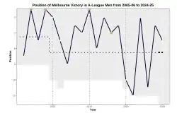 Victory's 2023–24 season was much more successful, finishing third overall on the ladder with 10 wins and 12 draws. After beating Melbourne City in the Elimination Finals on penalties, the team then advanced to the semi-final, beating Wellington Phoenix 2–1 on aggregate, advancing to the Grand Final. With a 3–1 loss to the Central Coast Mariners, Victory finished the season as runners-up.[122]