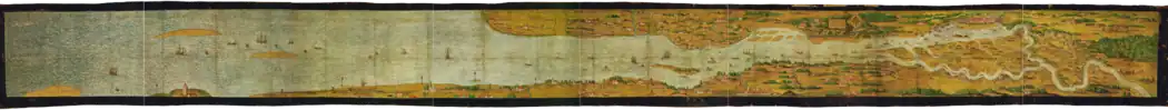In 1567 Melchior Lorck turns up in documents from the council of the city of Hamburg, and seems to remain there at least until 1572, when he draws up his last will and testament in that city.[10] Initially, Lorck was employed as cartographer, mapping the lower streams of the river Elbe, from Geesthacht to the sea, in order to support Hamburg's legal claims to the stable rights in a dispute with its neighbor Brunswick-Lüneburg. The magnificent map resulting from this commission is still in the possession of the State Archives of Hamburg today, where it remains one of the most precious holdings.[11]
