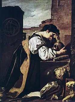 Artists from the sixteenth century used Melencolia I as a source, either in single images personifying melancholia or in the older type in which all four temperaments appear. Lucas Cranach the Elder used its motifs in numerous paintings between 1528 and 1533.[65][66] They share elements with Melencolia I such as a winged, seated woman, a sleeping or sitting dog, a sphere, and varying numbers of children playing, likely based on Durer's Putto. Cranach's paintings, however, contrast melancholy with childish gaiety, and in the 1528 painting, occult elements appear. Prints by Hans Sebald Beham (1539) and Jost Amman (1589) are clearly related. In the Baroque period, representations of Melancholy and Vanity were combined. Domenico Fetti's Melancholy/Meditation (c. 1620) is an important example; Panofsky et al. wrote that "the meaning of this picture is obvious at first glance; all human activity, practical no less than theoretical, theoretical no less than artistic, is vain, in view of the vanity of all earthly things."[67]