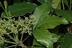 Melicope vitiflora, commonly known as northern evodia, fishpoison wood, leatherjacket or leatherwood,[2] is a species of shrub or small tree in the family Rutaceae and is native to north-eastern Australia and New Guinea. It has trifoliate leaves and green to white or cream-coloured flowers borne in panicles in leaf axils.