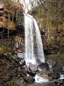 Melincourt Falls (Welsh: Sgwd Rhyd yr Hesg) is an 80 feet (24 m) high waterfall on Melin Court Brook, a left-bank tributary of the River Neath / Afon Nedd, located 1-mile (1.6 km) south of Resolven in the county borough of Neath Port Talbot, south Wales. It is formed where the brook plunges over a resistant band of 'Lower Pennant Sandstone' in a 13 acres (5.3 ha) nature reserve managed by the Wildlife Trust of South and West Wales.[1][2] The falls have been drawing visitors for at least two centuries – they are certainly known to have inspired J. M. W. Turner to paint them in 1794.[3] The falls are considered by some to constitute a part of Waterfall Country though the bulk of these falls are a few miles further northeast at the head of the Vale of Neath.