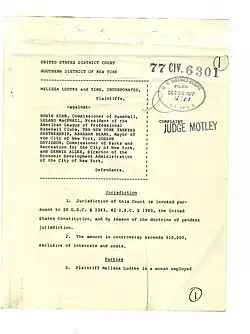 - ^ "Complaint: Melissa Ludtke and Time, Incorporated" (PDF). Melissa Ludtke and Time, Incorporated v. Bowie Kuhn, Commissioner of Baseball, et al. No. 7329663 / Civil Case No. 77C6301. National Archives and Records Administration. U.S. District Court for the Eastern District of New York. 1865-. Record Group 21: Records of District Courts of the United States, 1685 - 2009. December 29, 1977.