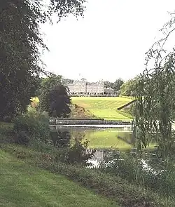 The House stands in 1,413 hectares of parkland, with an Italianate formal terraced garden in front of the south front. A sweeping stretch of lawn descends to a lake. [14] The original formal landscape was designed by William Adam, who had been involved in the 1725 House design. He created a long, tree-lined avenue leading to an ornamental canal and then in the distance to an 'eye catcher', the 'Hundy Mundy' tower, a tall Gothic folly consisting of an archway with square turreted towers, some 2.5 kilometres away. To the north, he created a long straight road to east and west to approach the House.