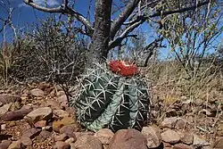 Melocactus zehnerii is a Turk's turban cactus native to the state of Bahia, in north eastern Brazil. It is also known as Melocactus giganteus and Cactus zehntneri.[1] Like other Turk's turbans, it has a roundish lower body with typically about eleven vertical ribs which does the photosynthesis and an elongated upper body, the cephalum, which is a type of capitate inflorescence. Its phyllotaxis is much higher; usually 34/55. This upper cephalum can grow as much as 72 cm (28 in) in length, and displaying as many as 16 annual rings.[2] one of the longest living of all inflorescences known. This species was discovered in 1968 by Leopoldo Horst and A.F.H. Buining.