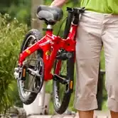 The Melon Slice folding system is relatively conventional and straightforward. First, it folds at the pedals and then at the handlebar stem. The bike is then folded in the middle of the top tube so that the two halves come together. With practice, the bike can be folded in about 15 seconds. The folded size of the bike is 34"L x 27"H x 13"W.