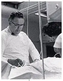 ![]() Judkins performing a catheterization procedure with the aid of a female nurse | |