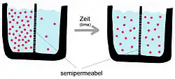 Thermodynamically the flow of substances from one compartment to another can occur in the direction of a concentration or electrochemical gradient or against it. If the exchange of substances occurs in the direction of the gradient, that is, in the direction of decreasing potential, there is no requirement for an input of energy from outside the system; if, however, the transport is against the gradient, it will require the input of energy, metabolic energy in this case.[3] For example, a classic chemical mechanism for separation that does not require the addition of external energy is dialysis. In this system a semipermeable membrane separates two solutions of different concentration of the same solute. If the membrane allows the passage of water but not the solute the water will move into the compartment with the greatest solute concentration in order to establish an equilibrium in which the energy of the system is at a minimum. This takes place because the water moves from a high solvent concentration to a low one (in terms of the solute, the opposite occurs) and because the water is moving along a gradient there is no need for an external input of energy.