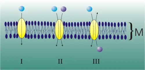Secondary active transporter proteins move two molecules at the same time: one against a gradient and the other with its gradient. They are distinguished according to the directionality of the two molecules: