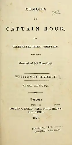 The Memoirs of Captain Rock is an 1824 satirical novel by the Irish writer Thomas Moore. It was first published in London by Longmans.[1] It was released the same year as the destruction of his friend Lord Byron's Memoirs which had left Moore £2,000 poorer. The story is inspired by the mythical Captain Rock, leader of a popular agrarian insurgency in Ireland similar to Captain Swing in England. It purports to be the memoirs of his family's career, told to a naïve visitor to the island.