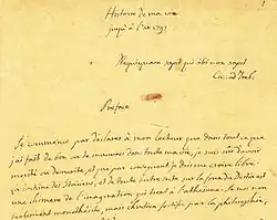 Following the acquisition of the manuscript by the Bibliothèque nationale de France, a new Pléiade edition, based on the manuscript, was published from 2013 to 2015.[3][9] The La Pléiade collection, published by Gallimard, offers a new edition in conformity with the original manuscript in 3 volumes published successively in 2013, 2014, and 2015. It retains Casanova's layout, punctuation and Italianisms. It is edited by Gérard Lahouati and Marie-Françoise Luna, with the collaboration of Furio Luccichenti and Helmut Watzlawick. It contains 2 prefaces, one written by Gérard Laouhati, entitled Un miroir magique (A Magic Mirror), the other written by Marie-Françoise Luna, entitled L'autre Casanova: des maîtres, des échos, des voix (The Other Casanova: the Masters, the Echoes, the Voices). This edition is enriched with footnotes that provides the translation of words or passages that may cause difficulty, the French version of Latin (or other) quotations inserted in the text and Casanova's main repentances that bear witness to his work as a writer and sometimes reveal the depth of his thoughts as well as rich endnotes.