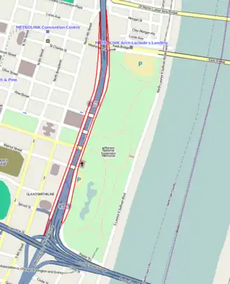![]() Memorial Drive outlined in red runs by the Arch Grounds on both sides of I-44 | |
