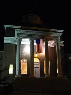 Memorial Hall is a symmetrical H-shaped building with one and a half stories and a full basement. It was designed by the Philadelphia firm of Day & Klauder as part of their overall campus master plan, which was drafted in 1917 with later revisions. The building features a Georgian Revival architectural style "reminiscent of Jefferson's designs for the University of Virginia", with exterior walls of Flemish bond brickwork and white wooden trim.[1] The majority of the windows are double-hung 12 over 12 sash windows, some of which are set in arched frames. Both the north and south facades of the building feature flat-roofed porticoes with Ionic columns. As originally built in 1924, the building consisted of only the hipped-roofed central hall and cupola with low wings on the east and west sides. During the 1940 rebuilding the central hall was expanded to the south to provide a new above-ground space for the library stacks, and gable-roofed extensions were added to the east and west wings.[1]