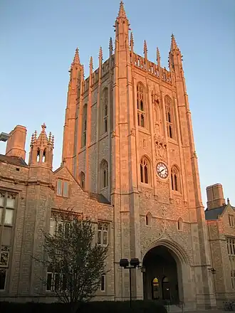 Plans for Memorial Union called for one wing for men and one wing for women. Each of the proposed wings would cost $200,000, and the two would be linked by a Gothic tower. The Simon Construction Company began work on the tower in January 1923,[3] and the first shipments of cut stone for the tower began arriving in 1924. Construction of the tower was completed after three years and dedicated in November 1926.