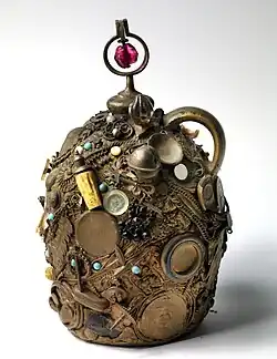 A memory jug may be any kind of vessel but is most usually a jug or vase. Items used to cover the surface range from shards of china, glass, and mirror to shells, beads, buttons, coins, medals, keys, jewelry, toys, watches, and other small objects.[1][2] These are adhered to the surface using some kind of adhesive, typically putty or cement.[1][2][3] The final piece may also be overpainted to create a more uniform surface.[3] Memory jugs are closely related to the broken-china mosaic form known as trencadÃs that began to appear in the early 20th century.
