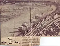 The NASCAR Grand National (now the NASCAR Cup) Series would visit this track numerous times during the 1955 and 1956 Grand National seasons.[2] Clint McHugh from Iowa (who tumbled over a guard rail and into a lake 50 feet below the embankment at the age of 28) [6] and Cotton Priddy from Louisville, Kentucky,[7] are the two race car drivers who died on this allegedly dangerous race track.[8] Since the 1960s, the track was never used for its intended purpose of stock car racing.[8] At a race held in November 1954, twelve thousand fans would attend a race spanning 250 miles (400 km) where Buck Baker would end up winning the 1954 running of the Mid-South 250.[9]