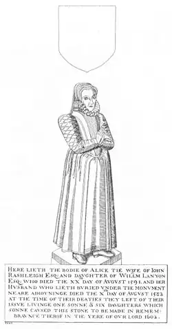 John Rashleigh (died 1582), a merchant at Fowey in Cornwall in 1573 purchased from Christopher Copleston (died 1586) of Copleston[10]: 224 in Devon, the estate of Menabilly, together with Treswethick, Trewrong and Penpol.[11] He was the second son of Philip I Rashleigh (died 1551) of Fowey.[1] He married Alice Lanyon (died 20 August 1591) (whose 1602 monumental brass survives in Fowey Church,[1]: image plate XLV ) daughter of William Lanyon by his wife Thomasine Tregian, daughter of Thomas Tregian.[1]