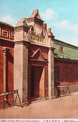 A predecessor of the Mengjiang Bank, the Chahar Commercial Bank, was established in the interwar period in Kalgan (now Zhangjiakou), then the capital of Chahar Province in Inner Mongolia. After conquering the region in the summer of 1937, the Japanese occupation forces established the region of South Chahar or Cha-Nan, and in 27 September 1937 established the Chanan Bank as a bank of issue fully owned by the Chanan occupation government,[2]: 36 which started operations in Kalgan on 1 October 1937 then opened branches in several cities of the region such as Hohhot.[2]: 37