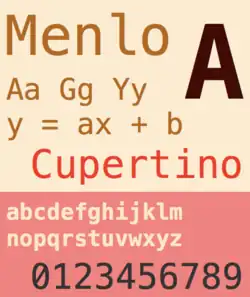 Menlo is a monospaced sans-serif typeface designed by Jim Lyles and Charles Bigelow. The typeface was first shipped with Mac OS X Snow Leopard in August 2009. Menlo superseded the Monaco typeface, which had long been the default monospaced typeface on macOS. Menlo is based on the open source font Bitstream Vera and the public domain font DejaVu.[1]