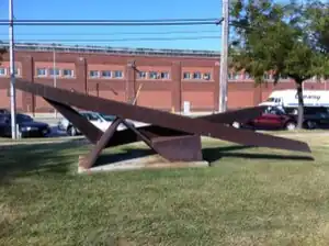 Menomonee is a Cor-Ten steel horizontal sculpture made up of beams welded at various angles. It sits on a concrete base with a plaque that reads "Menomonee/by Hilary Goldblatt/sponsored By/peck Meat Packing Corp." The plaque was installed on October 4, 1985, and is unsigned.[1] Goldblatt thought carefully about the Menomonee Valley when conceptualizing this site-specific sculpture. She came up with a balanced abstract form that is both open and enclosed, offering the viewer various angles from which it can be appreciated.