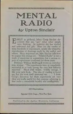 Mental Radio: Does it work, and how? (1930) was written by the American author Upton Sinclair and initially self-published. This book documents Sinclair's test of psychic abilities of Mary Craig Sinclair, his second wife, while she was in a state of profound depression with a heightened interest in the occult. She attempted to duplicate 290 pictures which were drawn by her brother. Sinclair claimed Mary successfully duplicated 65 of them, with 155 "partial successes" and 70 failures. In spite of the author's best efforts, the experiments were not conducted in a controlled scientific environment.[1]