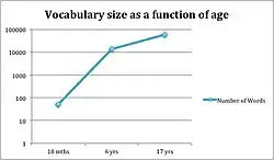 One aspect of research on the development of the mental lexicon has focused on vocabulary growth. Converging research suggests that at least English-speaking children learn several words a day throughout development. The figure on the right illustrates the growth curve of a typical English-speaking child's vocabulary size.[6]