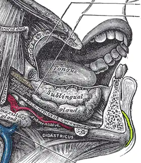 The mental space is a fascial space of the head and neck (also termed fascial spaces or tissue spaces). It is a potential space, bilaterally located in the chin, between the mentalis muscle superiorly and the platysma muscle inferiorly. These spaces may be created by pathology, e.g., the spread of odontogenic infection. Commonly the origin of the infection is an anterior mandibular tooth with associated periapical abscess which erodes through the buccal cortical plate of the mandibular at a level below the attachment of the mentalis muscle. The mental space also has the mental foramen located laterally on both the right and left sides. This is important as many mandibular nerves pass through these foremens. [1]
