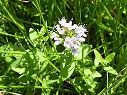 Genetically, along with M. gattefossei and Mentha pulegium, it has a base chromosome number of x = 10.[13] It is generally reported to have a somatic chromosome count of 2n = 48.[7][14] It is thought to be either tetraploid or pentaploid.[15]