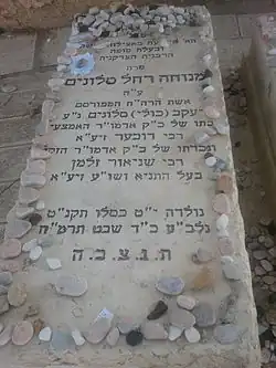 Today, the grave of Menucha Rochel Slonim receives hundreds of visitors every year,[13] especially on the anniversary of her passing.[14][15][16][17][18] It is located in the Old Jewish cemetery, Hebron.[19] The grave made headlines in 1997, when the H1 and H2 sections of the city were created.[20] Concerned residents and supporters protested the government to ensure that the cemetery and Menucha Rochel's final resting place were not left outside of the designated area. Other venerated Jewish scholars buried in the cemetery include Eliyahu de Vidas, Solomon Adeni, Elijah Mizrachi and Yehuda Bibas.