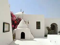 In some cases, in addition to these parts the houch has one or more ghorfas,[nt 1][6] towers or square blocks higher than the rest of the houch, situated at the corners.[7] Access to the ghorfas is by a rigid internal staircase without handrail,[6] under which there may be a deep niche (el-mkhaba) where the et-tass was kept, a small amphora with a wide neck where barley flour used as a base for zammita (or zommita),[2] one of the most traditionally eaten dishes in Djerba, especially at breakfast.[7] During the hot season, the menzels caps are used as sleeping quarters because of their coolness. They are the only parts of the menzel that have small openings facing outward, judiciously oriented so as to capture the sea breeze, which cools the interior.[7]