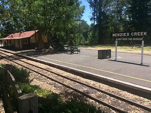 Menzies Creek has an island crossing platform with a track on each side, a loop siding and a siding into the Puffing Billy Narrow Gauge Museum.