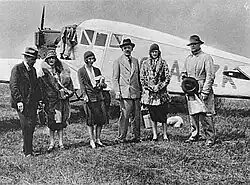 ![]() The passengers and crew in front of the Junkers aircraft, just prior to the aircraft's departure on the fatal flight. Pictured L-R: The Marquess of Dufferin, Mrs Sigrid Loeffler, Mrs Sarah Legh (did not fly), Sir Edward Ward, Viscountess Ednam, George Henderson (pilot). Leaning over the aircraft in the background is the co-pilot Charles Shearing | |