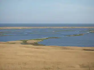 The Meotyda National Nature Park (Ukrainian: Національний природний парк «Меотида») covers a stretch of coastline, and interior estuaries and coastal lands, on the northern edge of the Sea of Azov in Ukraine. The administration of the park itself has been disrupted by hostilities in the area. Previously, the protected regions of the park supported important populations of migratory waterfowl and over 100 species of nesting birds. The current status of wildlife (as of 2018) depends on the varying levels of military activity in the park. Administratively, the park encompasses several subsidiary nature reserves and state lands, which retain their legal status.[1] The park is named for the Maeotians, an ancient people who lived on the Azov shores; ancient names for the Sea of Azov itself included Lake Maeotis and the Maeotian Sea. The park crosses several administrative districts, including Nikolske Raion, Novoazovsk Raion, and Manhush Raion in Donetsk Oblast
